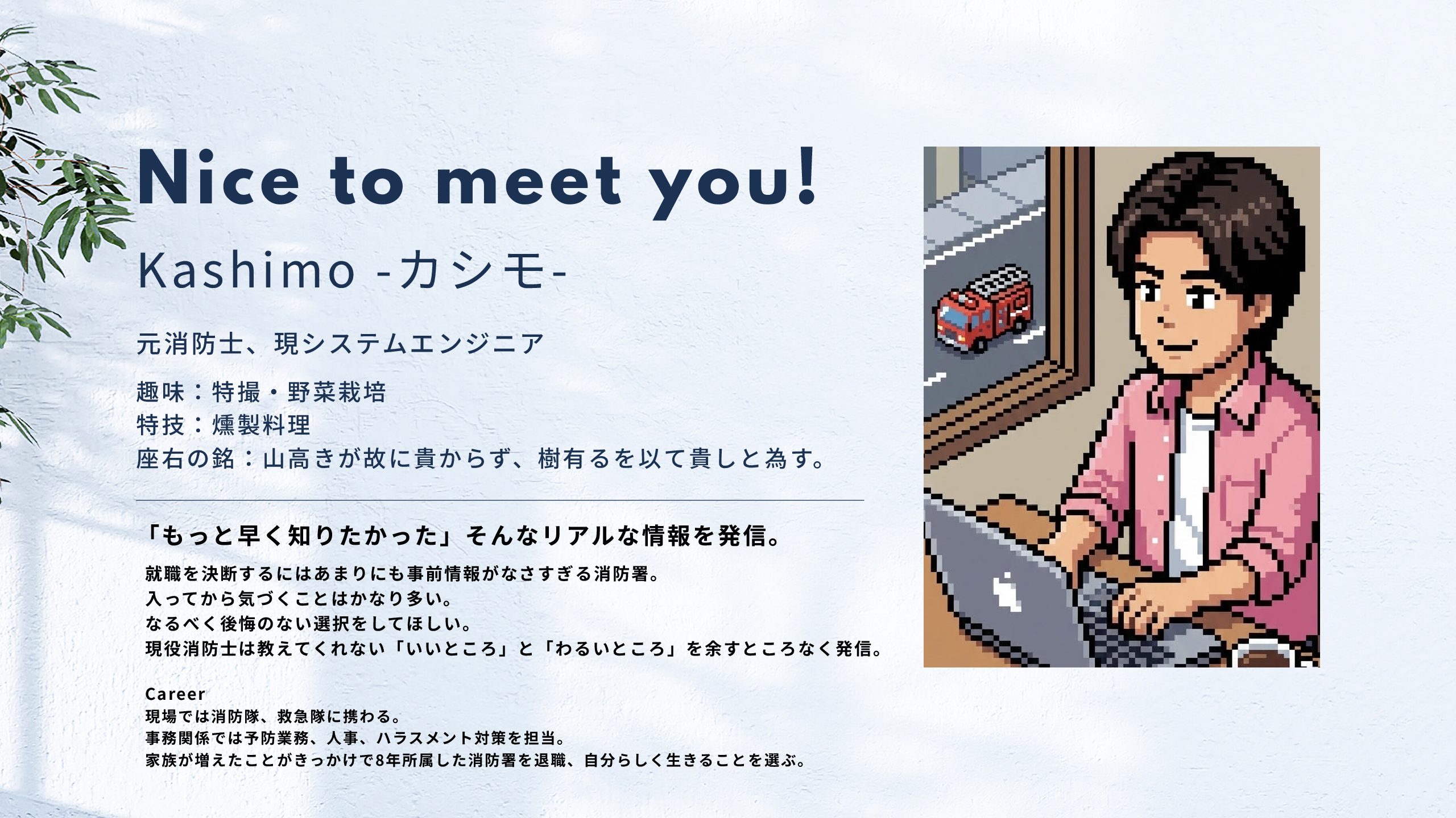 2025.12.172025.12.29 新着記事 消防士辞めたい、そんな方へ。 2026.01.05 体験談消防士やめたい 消防士を目指すか悩んでいる人へ|後悔しないために知っておくべきこと。 2026.01.05 体験談消防士になりたい 無料配布!試験前必携、面接・論文チェックリスト 2025.12.29 お役立ち 「公務員辞めるの怖くなかった?」 2025.12.29 体験談消防士やめたい もっと読む 人気記事 昇任制度!努力だけじゃ出世できない? 2025.12.29 ちゃんと寝られる?消防士の睡眠事情! 2025.12.29 主(カシモ)ってどんな人? 2025.12.29 勉強、マジでやる気がでない…そんなとき 2025.12.29 消防士辞めたい、そんな方へ。 2026.01.05 もっと読む プロフィール